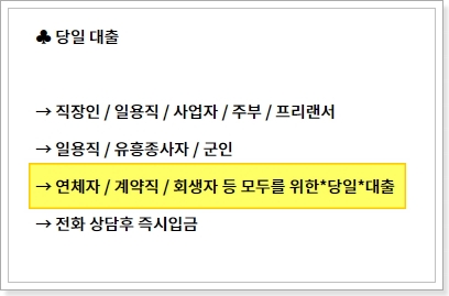 해당업체에서 작성한 세부 대출조건인데요. 보시는것처럼 연체자도 대출이 가능하고 당일대출이 가능하다고 하기 때문에 급전 필요한 신용불량자 분들은 머니투머니 들어가셔서 신불자대출 찾아 전화상담 해보시고 대출이 가능한지 불가능한지 여부를 대화해보시면 되겠습니다.